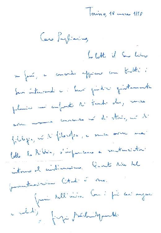 He leído su libro sobre Jesús y estoy completamente de acuerdo con todos sus comentarios y sus juicios justamente polémicos en los enfrentamientos contra quienes, sin tener ningún conocimiento de historia, ni de filología, ni de filosofía y sin haber leído nunca la Biblia, de improviso se convierten en sentenciadores acerca del cristianismo.