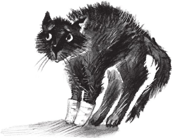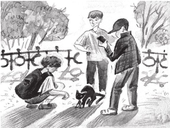 Но тут Бойкий сам отошёл в сторону, и Никита увидел чёрную тень, зажатую в мальчишеском кольце. Это была самая странная тень в его жизни. Она противоречила всем законам природы: постоянно меняла очертания, металась и подскакивала, отрываясь от земли. Её движения были так быстры, что Никита никак не мог разобрать, что же это в самом деле такое. Какой-то новый опыт? Игрушка? И вдруг сквозь хохот до него явственно прорезалось мяуканье. Всё ясно: это был кот. Их чёрный дворовый кот.