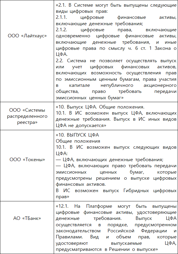 • четыре оператора информационных систем устанавливают прямой запрет на выпуск определенных видов цифровых активов. При этом формулировка такого запрета правилами операторов определена по-разному. Если операторы информационных систем ООО «Системы распределенного реестра», АО АКБ «ЕВРОФИНАНС МОСНАРБАНК» в правилах сформулировали запрет в виде общей формулы: «выпуск в информационной системе иных видов цифровых финансовых активов не допускается», то операторы информационной системы ООО «Лайтхаус» и ООО «Блокчейн Хаб» указали на конкретные виды цифровых финансовых активов, выпуск и учет которых в системе не осуществляется, – цифровые финансовые активы, включающие возможность осуществления прав по эмиссионным ценным бумагам, права участия в капитале непубличного акционерного общества, право требовать передачи эмиссионных ценных бумаг.