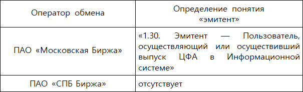 Определение понятия «эмитент» в правилах операторов обмена [18]