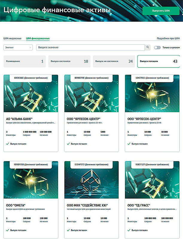 Второй выпуск этой же компании предполагал одинаковое количество цифровых финансовых активов (минимальное и доступное к приобретению), при которых выпуск считался состоявшимся, – 10 000 цифровых финансовых активов (данные также отражены в карточке выпуска).