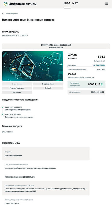 В карточке выпуска цифровых финансовых активов представлена вся информация о выпуске: количество выпущенных цифровых финансовых активов, текущая цена (так как выпуск цифровых финансовых активов – с базисным активом золото), смарт-контракт, решение о выпуске, котировки, информация о периоде размещения.