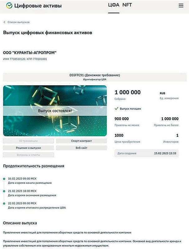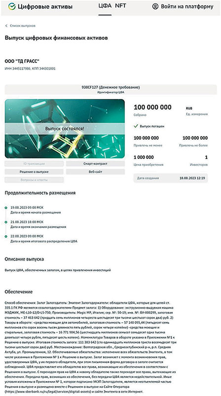 Рис. 4. Скриншот Платформы Сбера «Цифровые активы» (эмитент – ТД «Грасс»)