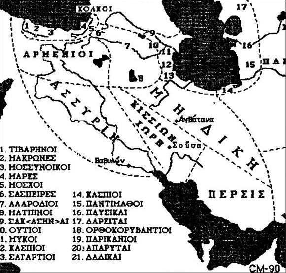 Как во время начала своего переднеазиатского похода, так и по возвращении из него скифы проходили через территорию Кавказа. В этой связи интересно сообщение римского поэта I в. н. э. Валерия Флакка. При перечислении скифского войска он называет в его составе следующие племена: «Здесь и благоухающие надушенными волосами микэи, и рати кессейские, и ты, невинный вследствии неведения металлов Аримасп, еще не раскапывающий своей земли, и Авхат, умеющий раскидывать широким кругом летучие арканы и притягивать петлями самые дальние отряды»[47]. Авхат здесь является эпонимом авхатов – упоминавшегося выше племени скифов-пахарей, ведущих свое происхождение от Липоксая, брата Колоская. Вместе с ним Флакк называет и «рати кессейские», название которых связано с Киссейскими горами (monies Cissii), под которыми Плиний понимал северо-восточные отроги Кавказа. Весьма показательно, что в то же самое время первый римский географ Помпоний Мела, написавший свой труд «Хорография» около 43 г. н. э., при описании Азии отмечает: «Выше амазонок и гипербореев – киммерийцы, киссианты, ахеи, георгилы, мосхи…»[48] В большинство рукописей стоит форма cisianti, которые находились где-то в районе Кавказа. Что касается ахеев, то они локализуются в северо-западной части современного района Сочи и на территории Туапсинского района, а георгилы связываются с современными грузинами. Плиний Старший приводит интересующий нас этноним уже раздельно: «Прямо за ними уже скифы, киммерийцы, киссы, анты, геогри и племя амазонок, последнее (простирается) вплоть до Каспийского и Гирканского моря»[49]. Как известно, позднее антами Иордан и византийские писатели называли союз славянских племен, который в данном тексте неожиданно упомянут в районе Кавказа. Следует обратить внимание и на «рати кессейские», равно как и Киссейские горы: данный корень фиксируется и на территории Персии. Из текста Геродота следует, что знаменитые Сузы находились в «земле киссеев», где протекали реки Хоасп и Гинд. При описании различных народов, входивших в войско Ксеркса, «отец истории» отмечает, что киссии были вооружены как персы, но, в отличие от них, вместо войлочных шапок они носили митры, под которыми комментаторы понимают повязки на лбу, концы которой свешивались по обеим сторонам лица[50]. В связи с последней особенностью приведем описание Авхата у Валерия Флакка: «У него издавна белые волосы, прирожденный знак; пожилой возраст уже образует простор на голове; обвивая виски тройным узлом, он спускает со священной главы две повязки»[51]. То обстоятельство, что часть территории Ирана называлась так же, как и часть Кавказа, подтверждает высказанное выше предположение о том, что скифы при своем возвращении в Европу увлекли с собой часть населения, жившего на Древнем Востоке. Едва ли является случайным совпадением и то обстоятельство, что в ахеменидскую эпоху сатрапия Киссия занимала в том числе и ту территорию, где во времена Саргона II существовала страна Рас (рис. 5). Название реки Гинда точно так же может указывать на присутствие индоарийского элемента, как и интересующее нас древнее название Волги.