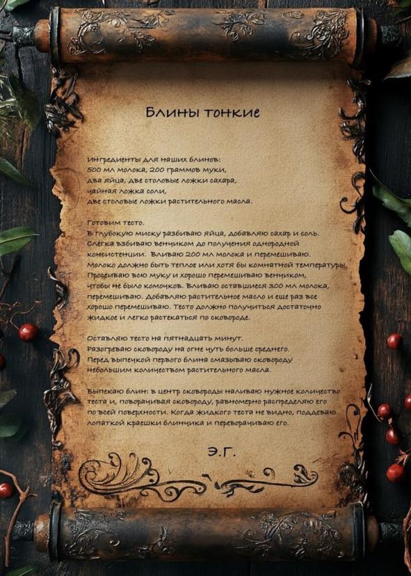 – Этот древний свиток многих поколений поваров будет твоим первым артефактом магии кулинарного искусства.