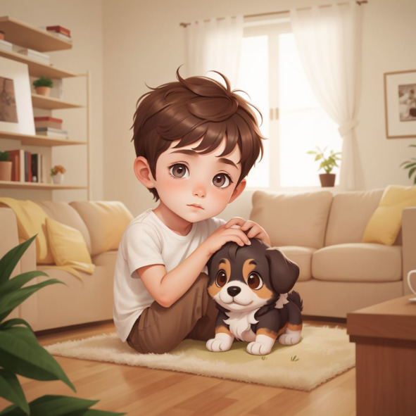 Liam had always wanted a pet. He often dreamed of having a furry friend to play with. One sunny morning, his parents called him to the living room. There, in a small basket, was a cute puppy. “His name is Benjamin,” said Liam’s mom. Liam’s eyes sparkled with joy. He hugged the puppy tightly. “Thank you, Mom and Dad!” he exclaimed.