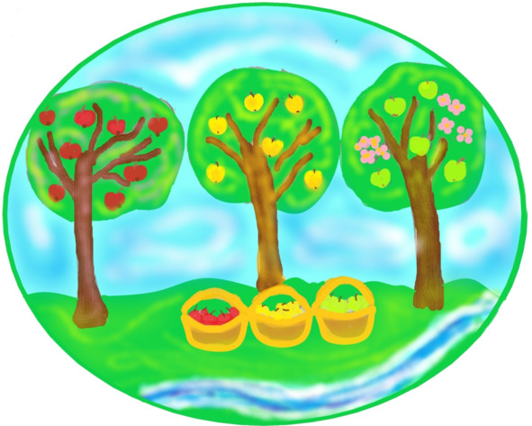 Собрала Алинка три спелых яблока, от которых аромат свежий, зрелый шёл. Первое сорвала – увидела, вместо своей лачужки, новый дом. Второе сорвала, видит – очистилась в деревне родной от тины река. Третье сорвала, а оно, в руках её, алым стало.