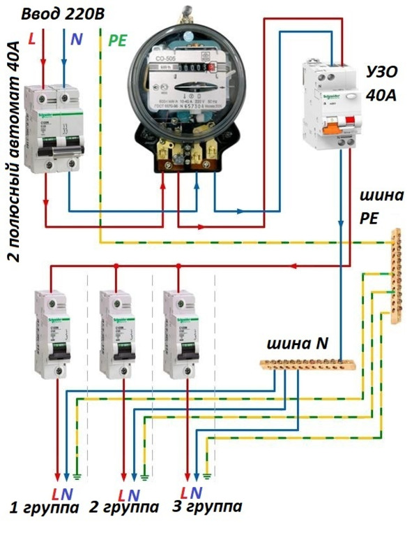 На обеих схемах указаны группы, направления потока напряжения в которых разделены по три. Три потока подачи напряжения являются минимальным количеством, направленных в дом. Где каждый из потоков «сидящий» на отдельном автомате УЗО, подпитывает свою группу электроприборов. Группы могут быть больше, 5, 10 или 20шт, на ваше усмотрение. Можно каждую комнату в доме «посадить» на отдельную группу. Чем больше будет групп, тем меньше нагрузки создастся на автоматы. Минимальное количество рекомендованных групп – три. Где на первую группу можно подключить все приборы освещения в доме. На вторую группу – розетки. На третью – кухонную зону, где приборами потребления являются: электрочайник, микроволновка, варочная панель, духовой шкаф и бойлер.