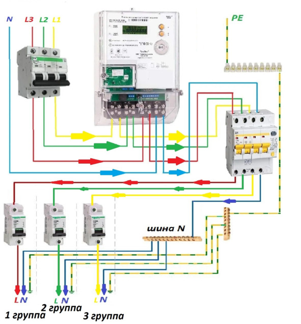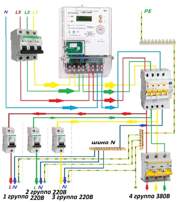 Во всех описываемых выше группах, подаваемое напряжение равно 220в. При необходимости можно создать дополнительную группу для приборов, потребляющих трехфазное напряжение (380В), как на схеме. Фото