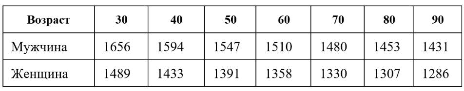 Суточная величина основного обмена в килокалориях, рассчитанная по формуле Дрейера для людей массой 70 кг