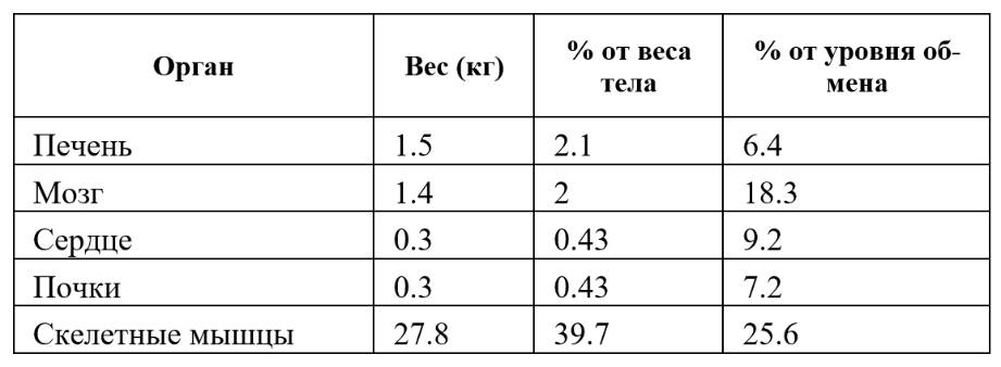 В этой формуле учитывается, что разные ткани нашего организма требуют разное количество энергии.
