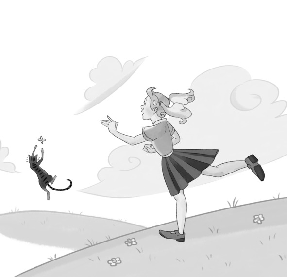 Вдруг налетел ветерок. И откуда ни возьмись появилось облачко, да так низко, что рукой можно потрогать. Бабочка села на него и крылышками машет, будто зовёт за собой. Старый кот прижался к земле всем телом, задрожал, приготавливаясь к прыжку, разбежался и запрыгнул на облако. Оно покачнулось и стало быстро подниматься вверх, унося с собой Алёшку высоко в небо от маленькой девочки.