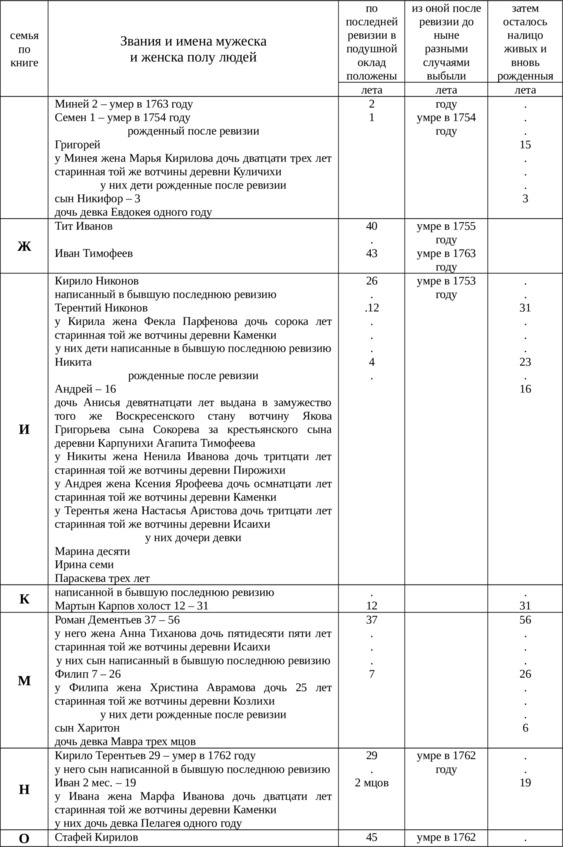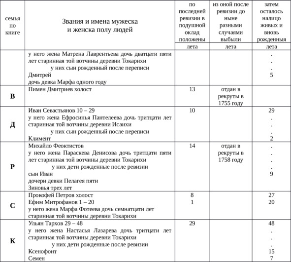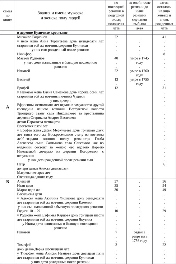 Итого в оной деревне Куличихе по второй ревизии состояло мужеска полу 64 души. И с той ревизии выбыло вышеприписанными случаями – 26. И со второй ревизии налицо – 38, у них после ревизии новорожденных – 34, итого ныне налицо – 72. Женска полу выданных в другие вотчины в замужество – 6. Всего налицо в оной деревне Куличихе – 78.