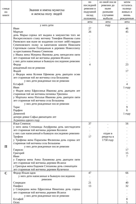 Всего в вышеописанной вотчине в селе Белышеве с деревнями и в деревнях же Карамышеве и Отлузихе по второй ревизии состояло мужеска полу 791 душа. Ныне выбыло вышеприсанными случаями – 308, затем из второй ревизии налицо – 483, у них после ревизии новорожденных – 413, из бегов прибыло – 14. Итого ныне налицо – 910. Женска полу выданных в замужество в другие вотчины – 44. Ныне налицо – 1056.