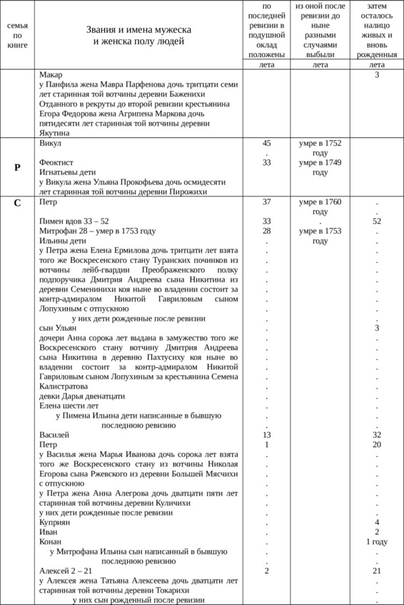 Здесь представлена ещё одна семья, не оставившая в деревне Куличихе своих наследников и, о которых ко 2-й ревизии ничего не известно. Крестьянин Федот Никитин и его сын Мокей, показанные в переписи 1719 года в бобыльском дворе, скорее всего, были переведены или проданы в другое поселение, или, что менее вероятно, оба померли до 1744 года. Данная семья (Т) далее показана не будет.