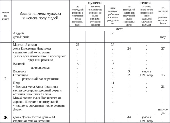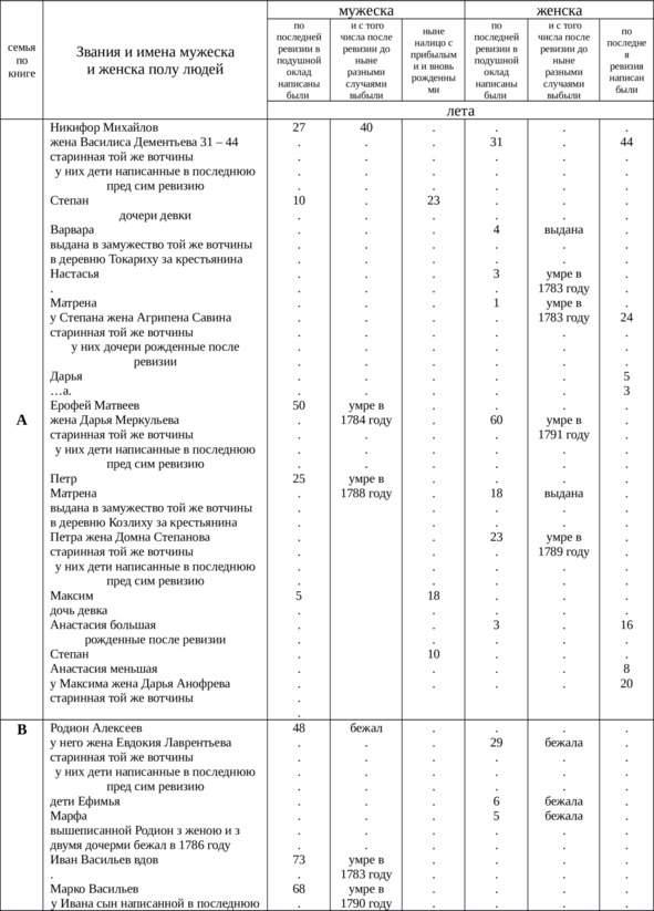 1795 году июня 27 дня вотчины господина генерал аншефа и разных орденов кавалера князя Платона Степановича Мещерского Костромского наместничества Варнавинской округи села Николаевского Белышево тож выборная деревни Баженихи крестьянин Трофим Михайлов да вотчинной земской села Белышево крестьянин Самойло Иванов по силе состоявшегося 1794 года июня 28 дня Её Императорского Величества и в народ публикованного указа с ведома господина нашего дал он сказку о положении написанная господина нашего деревням по последнея 1782 года ревизия в подушном окладе о людях и крестьянах с показанием и с того числа разными случая убылых и после ревизии вновь рожденных и прибылых по самыя истины без всякия утаяния а буде кем впредь обличены или посвятельству найдется что ново либо утаяния то повелены положенному по указам штрафу20.