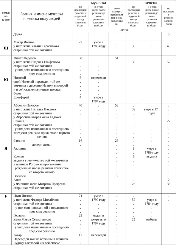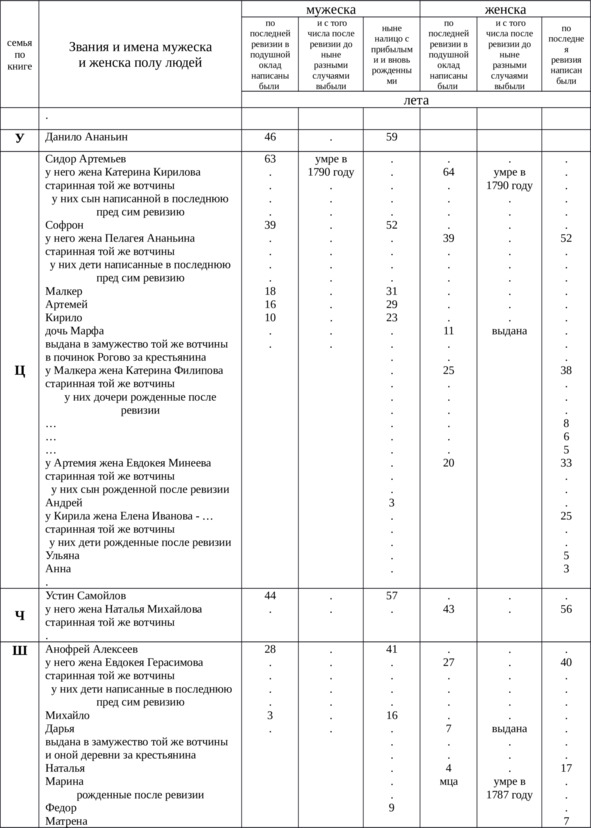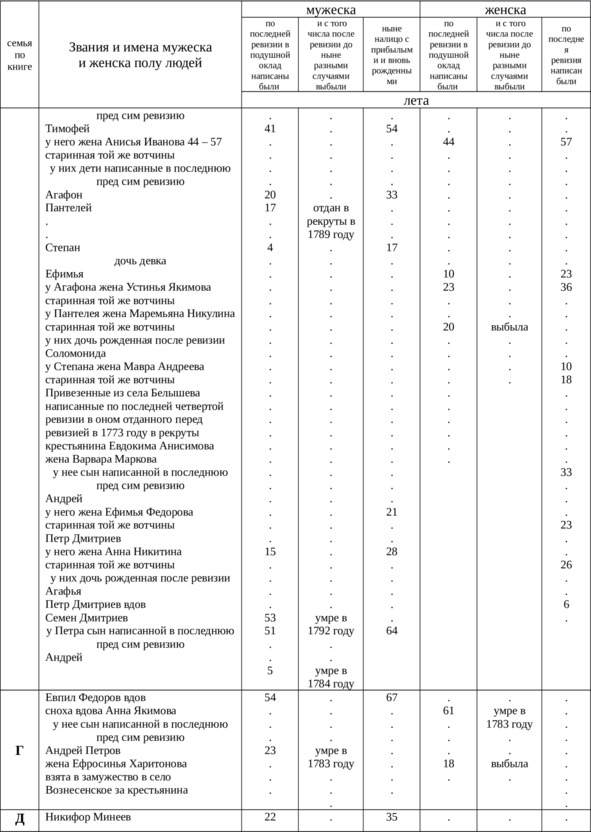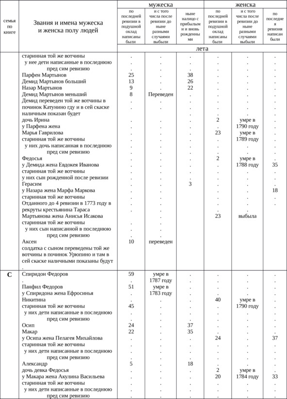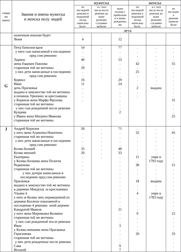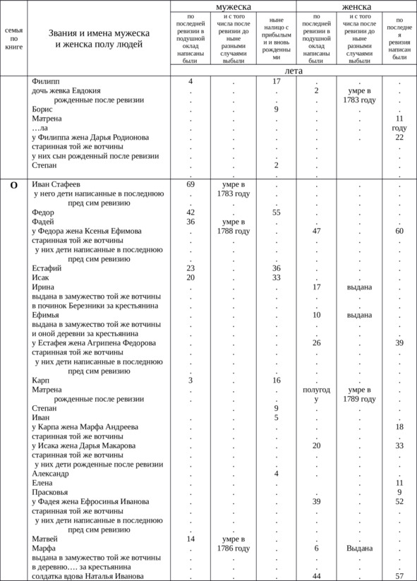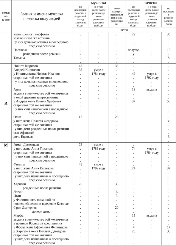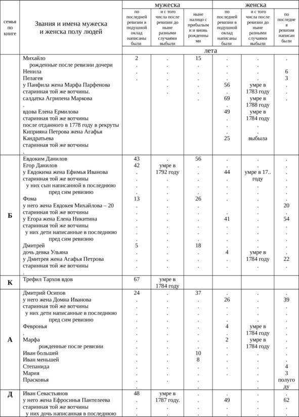 Итого в оной деревне Куличихе крестьян мужского пола всего – 78, выбыло после 4-й ревизии – 36, женского пола – 87, выбыло – 57, всего 165 душ.