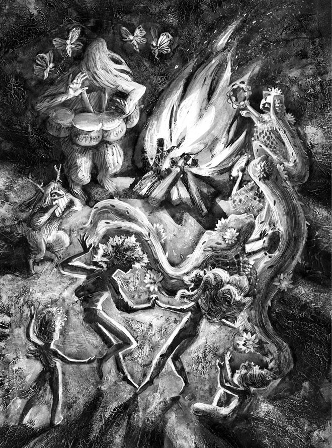 К костру надо идти тихо, потому что иначе можно случайно привести чужих. Они прокрадутся за тобой по следу, проберутся на праздник и отравят огонь, и он сделается жгучим и злым и перестанет дарить свет и тепло. Ещё можно наткнуться на лешего, он запутает твои следы, и ты увидишь, что свет костра – это сияние заката над обрывом, в который вот-вот упадёшь. Или можно привести недовольного Духа Подземных вод, и он придёт и проглотит весь огонь из страха и зависти. Или – самое худшее – по твоему следу придёт старуха из Дома-с-огнями, и украдёт огонь, и запрёт его навечно в один из своих жутких черепов.