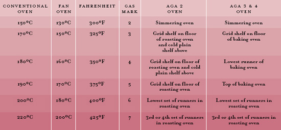My basic method for cooking a pie involves first preparing the filling and then baking the filling in a pastry case or just covering with pastry. I tend to cook the filling on a simmering plate, using a large cast iron or ceramic casserole dish. If it is cooking too fast I put a coin under the pan. When it comes to baking, I usually pop the pie on the grid shelf on the lowest set of runners, in the roasting oven, then check after about 15 minutes and cover with foil if it looks like the pastry is brown enough. Below is a general guide to converting the temperatures used in this book for your Aga.