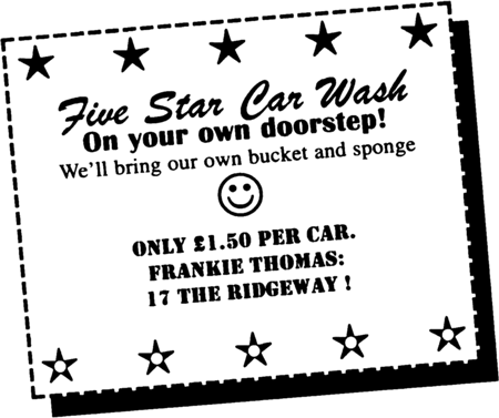 At first we couldn’t agree how much we should charge. We finally settled on $1.50, which seemed a lot, but we had to share it between five. Still, as Kenny had said, we’d be able to clean more cars so we’d earn more in the long run.