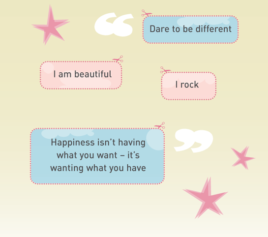 For those moments when you don’t feel like the sparkle-shine glitter girl that you really are, mutter a marvellous mantra. A mantra is a few simple words, a phrase or a sentence that will boost your motivation and confidence and encourage you to Think Pink. I’ve got them everywhere, on my mirror, in my school books and I’ve even sewn ‘you rock’ onto my school bag – I’m so art girl! These are a few of my favourites, cut them out, tape them up and be inspired!