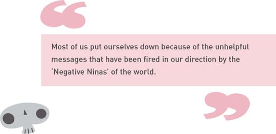 Most of us put ourselves down because of the unhelpful messages that have been fired in our direction by the ‘Negative Ninas’ of the world – teachers giving us a low mark, our so-called mate not picking us for the hockey team, parents saying we’ve done something wrong – the list is endless.