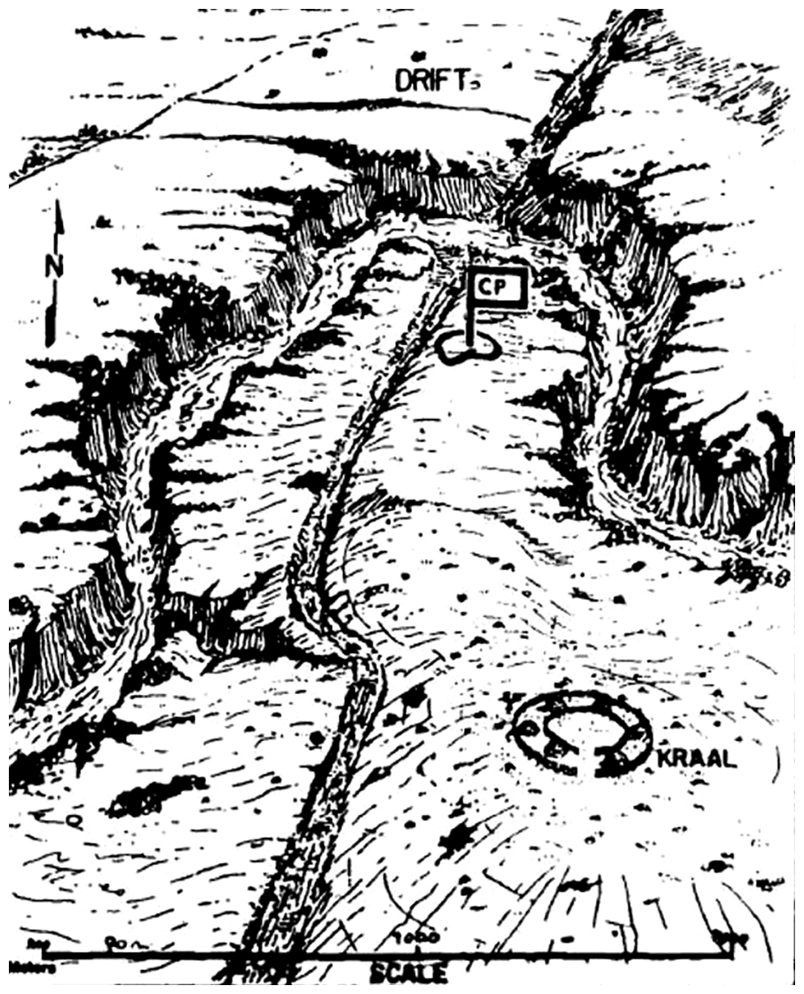 Где-то в двух километрах к северу от брода высилась скалистая столовая гора, а где-то в миле к северо-востоку находилась типичная для этих мест сопка – копье, покрытая кустами и усеянная булыжниками, крутая с южной стороны, но плавно спускающаяся с северной; с ближней стороны сопки располагалась ферма. Где-то в километре к югу от брода стоял выпуклый и ровный холм, напоминавший вывернутый наизнанку котлован, увенчанный редкими россыпями булыжников. На вершине располагался каффирский крааль, состоящий из нескольких глинобитных хижин с соломенными крышами. Между рекой и холмами на севере раскинулся открытый и практически ровный вельд; на южном берегу вельд был более холмистым, но столь же открытым. Вся местность была усеяна крупными термитниками.