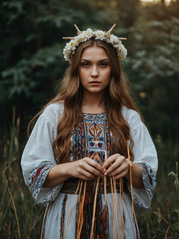 Макошь – не дева красная в венках цветочных, а женщина зрелая, мудрая. Лик её строг, но в глазах – глубина небесная, а в руках – веретено волшебное, что судьбы прядёт. Не любит она лени да пустословия, а ценит труд упорный да руки умелые. Хочешь её расположить – покажи, что достоин ты даров её.