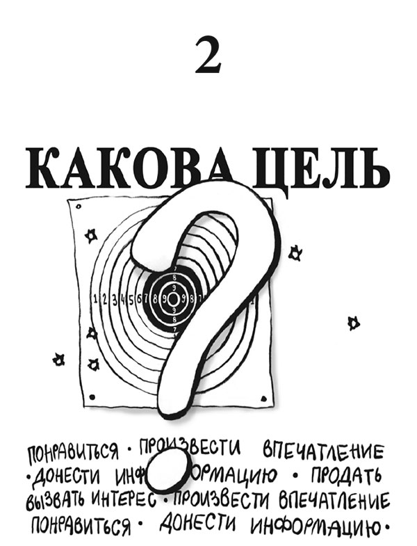 Цель любой деятельности, как вы знаете, лежит за пределами этой деятельности. А аплодисменты – внутри. Какова ваша истинная цель? «Создать впечатление! Донести информацию! Запомниться! Понравиться!» – отвечают обычно участники моих тренингов. «А зачем? – спрашиваю я. – Ради какой цели?» И тут-то приходит прозрение! Для того чтобы ускорить этот процесс, задам главный вопрос: «Что должны сделать ваши слушатели после выступления?». Не «сходить в буфет», а: