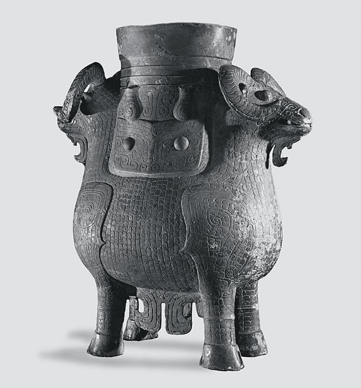 В то время как в западном мире из бронзы в первую очередь изготавливали оружие и инструменты, а также нательные украшения, древнекитайские мастера создавали из нового сплава еще и искусные ритуальные сосуды. Их поразительные формы помогают судить об их предназначении: приземистые котелки на трех расходящихся ножках, называвшиеся дин, были крепкими и непритязательными – как раз подходящими для приготовления пищи. Вытянутая форма цзюэ, винных графинов-треножников, украшенных рельефными узорами, кажется воплощением самого действия разливания. Их формы напоминали прежние виды керамических сосудов, которые возникали на протяжении многих веков для различных нужд [4]. В окруженном стенами городе Эрлитоу, в центральной части Китая, одном из первых мест, где появились литейные мастерские, мастера изготавливали бронзовые сосуды такой же формы, как и керамические горшки, созданные более тысячи лет назад [5]. Это были ритуальные сосуды, их ставили в могилу для почитания покойного. Те, кто занимался их изготовлением, обладали высоким социальным статусом – литейщики бронзы относились к благородному сословию [6]. В городе Аньян, столице династии Шан, ознаменовавшей первую великую эпоху Древнего Китая, мастера отливали цзунь – похожий на кувшин сосуд для вина с двумя ручками по бокам: его полные бока указывали на полноту содержимого, а веселые изображения вдыхали жизнь в безмолвный и тяжелый горшок.