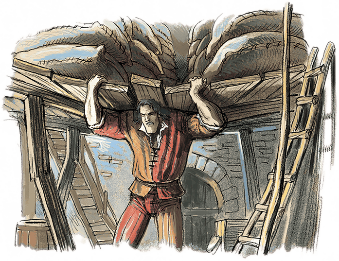 Этот Раньеро отличался необыкновенной силой. О нём говорили, что железные доспехи он мог бы носить так же легко, как другой – шёлковую рубашку. Несмотря на молодость, он уже много раз доказывал свою силу. Однажды ему пришлось быть в одном доме, на чердаке которого было ссыпано зерно. Но зерна оказалось слишком много, и как раз тогда, когда Раньеро был в доме, одна из чердачных балок надломилась, и на потолке появилась трещина. Все выбежали на улицу. Все, кроме Раньеро. Он поднял руки и поддерживал потолок до тех пор, пока люди не натаскали балок и жердей, чтобы подпереть его.