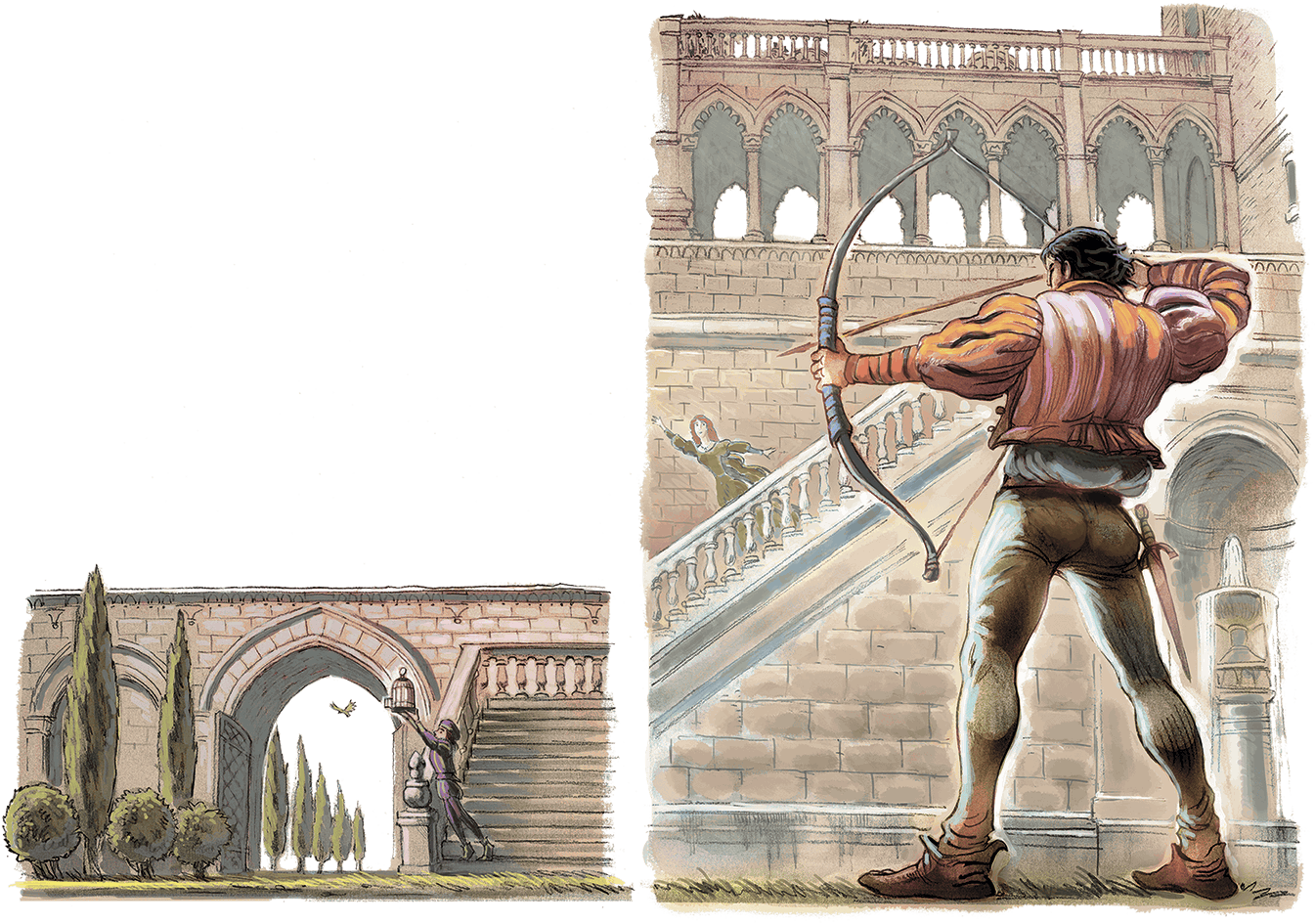 Франческа вошла в дом Раньеро, и на первых порах всё у них шло хорошо. Спустя несколько недель после свадьбы Раньеро вздумал поупражняться в стрельбе в цель. Несколько дней подряд он стрелял в картину, висевшую на стене. Скоро Раньеро пристрелялся и бил без промаха. Под конец ему захотелось попробовать свою меткость на какой-нибудь более трудной цели. Он стал подыскивать мишень, но ничего подходящего не находилось. И тут его взгляд упал на перепела, висевшего в клетке над воротами. Птица принадлежала Франческе, и она очень любила её. Но Раньеро приказал слуге отворить клетку. Перепел взвился в воздух, и он застрелил его на лету.