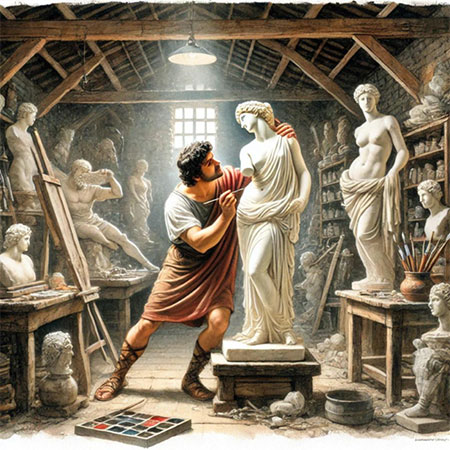 – На первый взгляд это прообраз Пигмалиона, скульптора с Кипра, который, согласно древнегреческой мифологии, вырезал из слоновой кости либо изваял из мрамора женскую статую и, назвав ее Галатея, влюбился в нее. Говорил с ней, одевал ее в одежды, украшал драгоценностями и целовал. Он мечтал о том, чтобы статуя ожила.