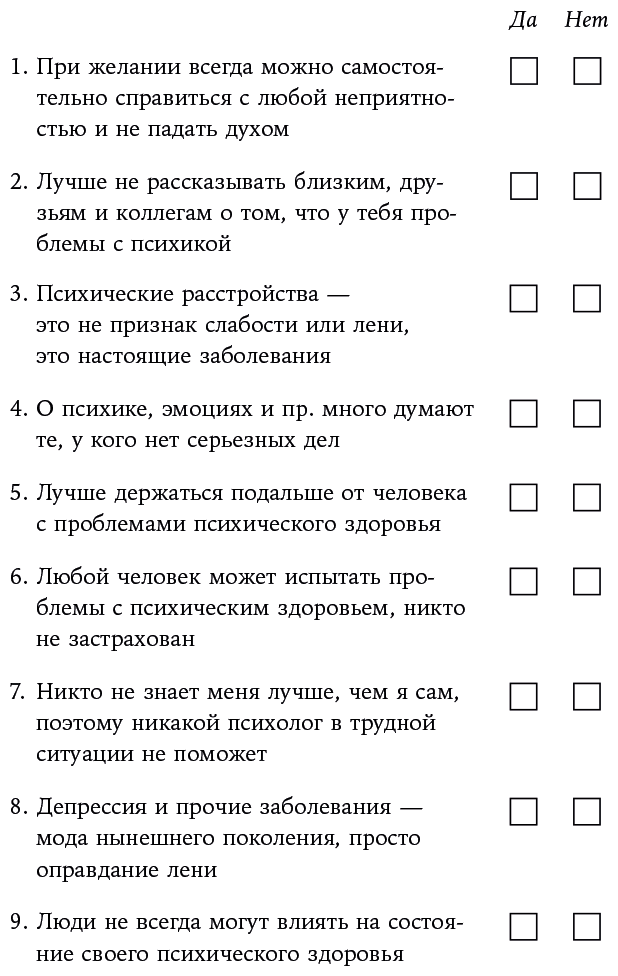 Тут кроется и ответ на вопрос, зачем читать такие книги, как та, что вы держите в руках, и вообще думать о психическом здоровье, если с вами и так в целом все в порядке. Распространен стереотип, что психология нужна только «ненормальным», «психам». Это как если бы мы сказали, что двигаться и хорошо питаться нужно только тем, у кого проблемы с суставами и гастрит. Я знаю, что некоторые спохватываются и начинают думать про образ жизни только после первого инфаркта – бросают курить, пить и начинают есть меньше соли. Но я все же надеюсь, что вы, мои читатели, не будете дожидаться ни инфаркта, ни эмоциональных срывов или выгорания, чтобы начать поддерживать здоровье.