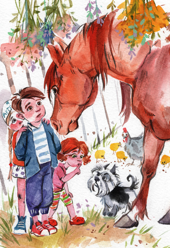 Из-за деревьев показался конь гнедой масти. Он степенно ступал и двигался прямо к ребятам.