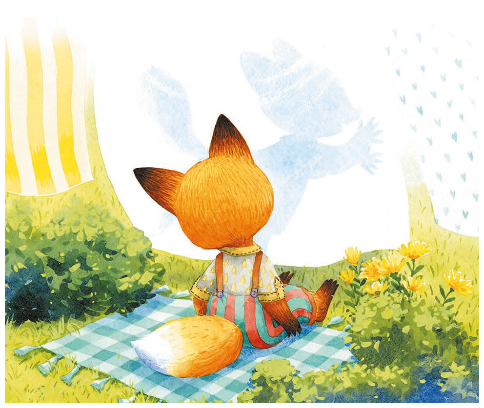 Они вышли на залитую солнцем лесную опушку возле домика. Мама повесила простыню, и её тень отразилась на ткани. Когда она закончила, то с помощью лап изобразила тень птички, а потом зайчика, но лисёнок этого не заметил: он сидел, пригорюнившись, у корзины с бельём и, не глядя на маму лису, подавал ей что попадётся из корзины. Помощи от Фырка было с гулькин нос.