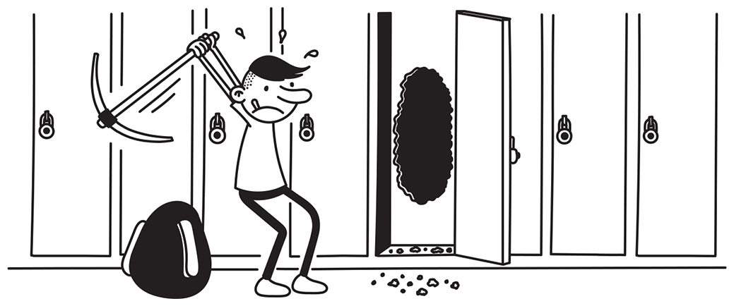 Ребята вычислили, что дыра между нашими шкафчиками помогает сократить путь из корпуса А в корпус Б. И теперь, открывая на переменке шкафчик, я вижу очередь, которая ждет, когда их впустят.