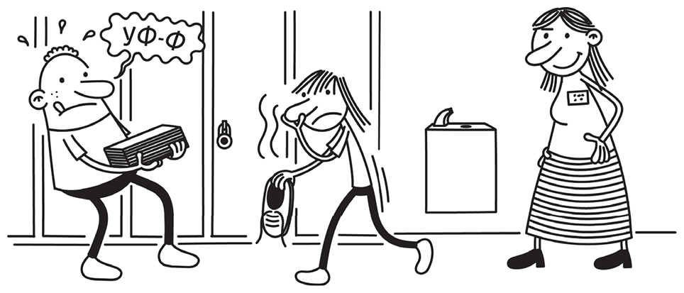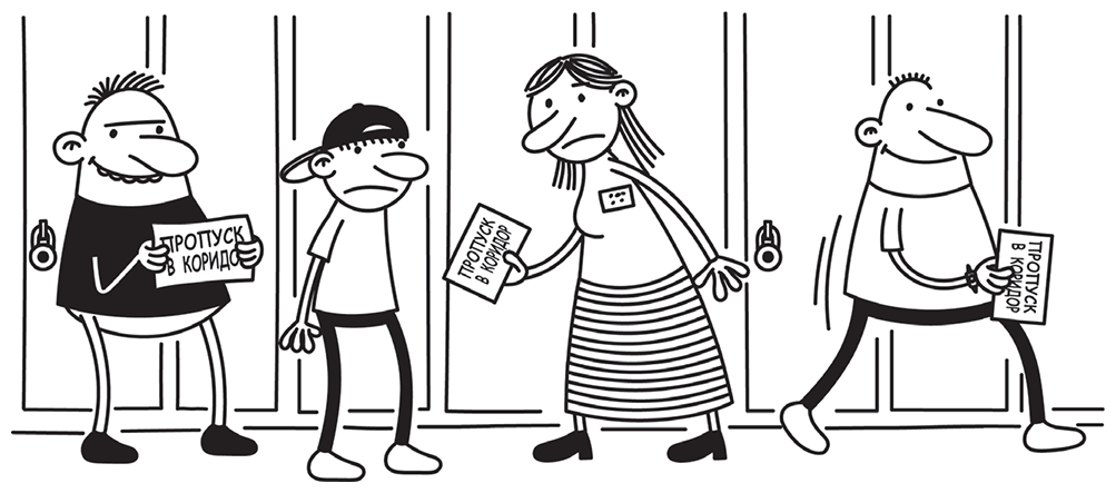 Новое правило гласит: «Если во время урока тебе надо выйти в коридор, ты должен получить специальный пропуск». Могу понять, почему директор Боттомс ввёл такое правило: иногда кажется, что в коридоре ребят больше, чем в классах.