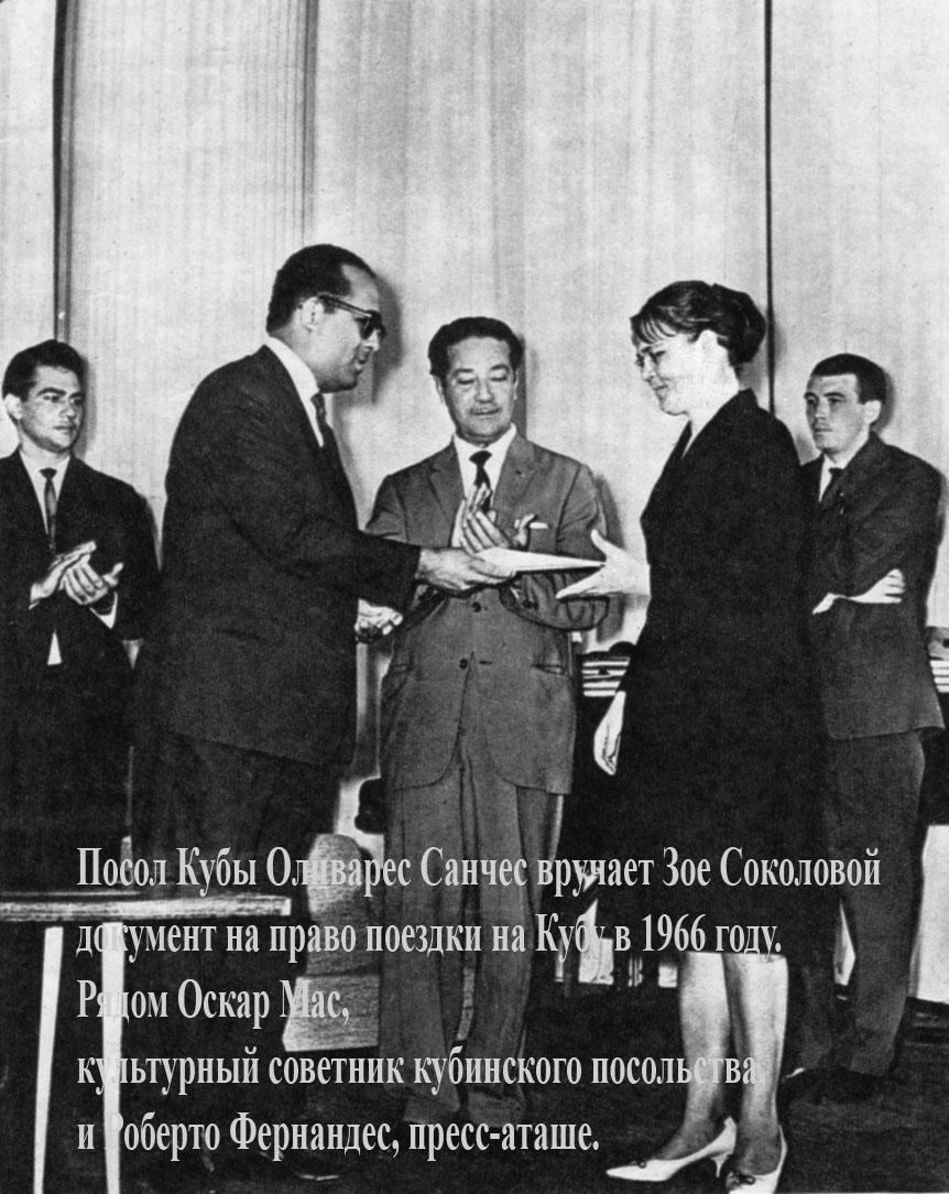 Поездка состоялась в 1967 году. Принимал меня на Кубе, кроме журнала «Куба», Кубинский институт дружбы с народами (ИКАП). В первые же часы по прибытии в Гавану меня навестил в гостинице «Капри», где я остановилась, вице-президент ИКАП по социалистическим странам Фернандо Герреро. Невозможно забыть ту встречу с человеком, который раскрыл передо мной карту Кубы и произнес: «Зоя, ты можешь назвать любую точку на карте, где ты хотела бы побывать. Твое желание будет исполнено». Так я составила собственный маршрут поездки, где на первом месте был, конечно, район высадки с «Гранмы» и другие памятные места, связанные с революцией.