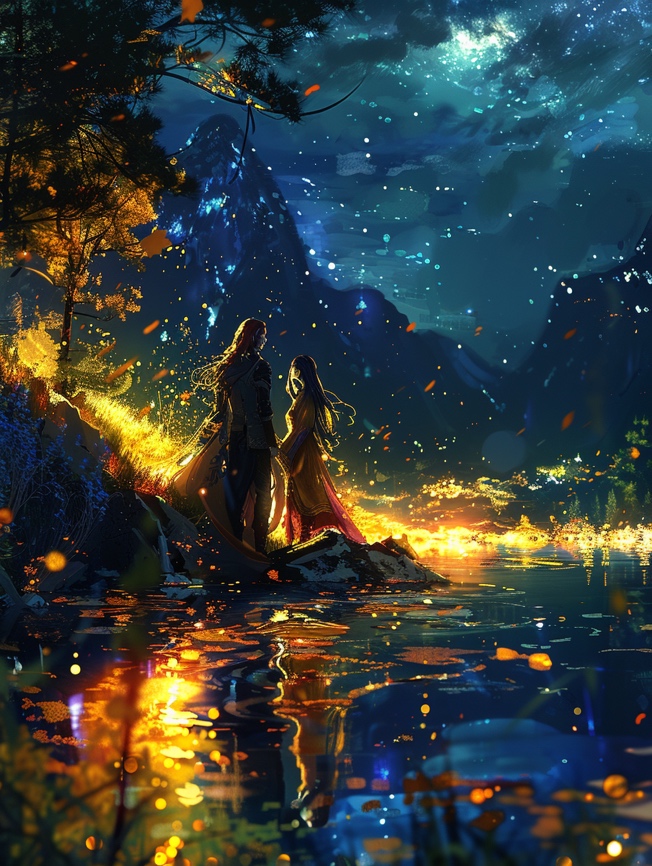 За разговорами время пролетело незаметно. Вечер вступил в свои права, накрывая лес тёмным покрывалом. На улице зажглись магические фонарики, по озеру поплыли шары света, отражаясь от воды. В воздухе закружились лепестки цветов однодневок. Разгорячённые пуншем из нектара люди садились ближе, разговаривали громче, темы для бесед становились душевнее.