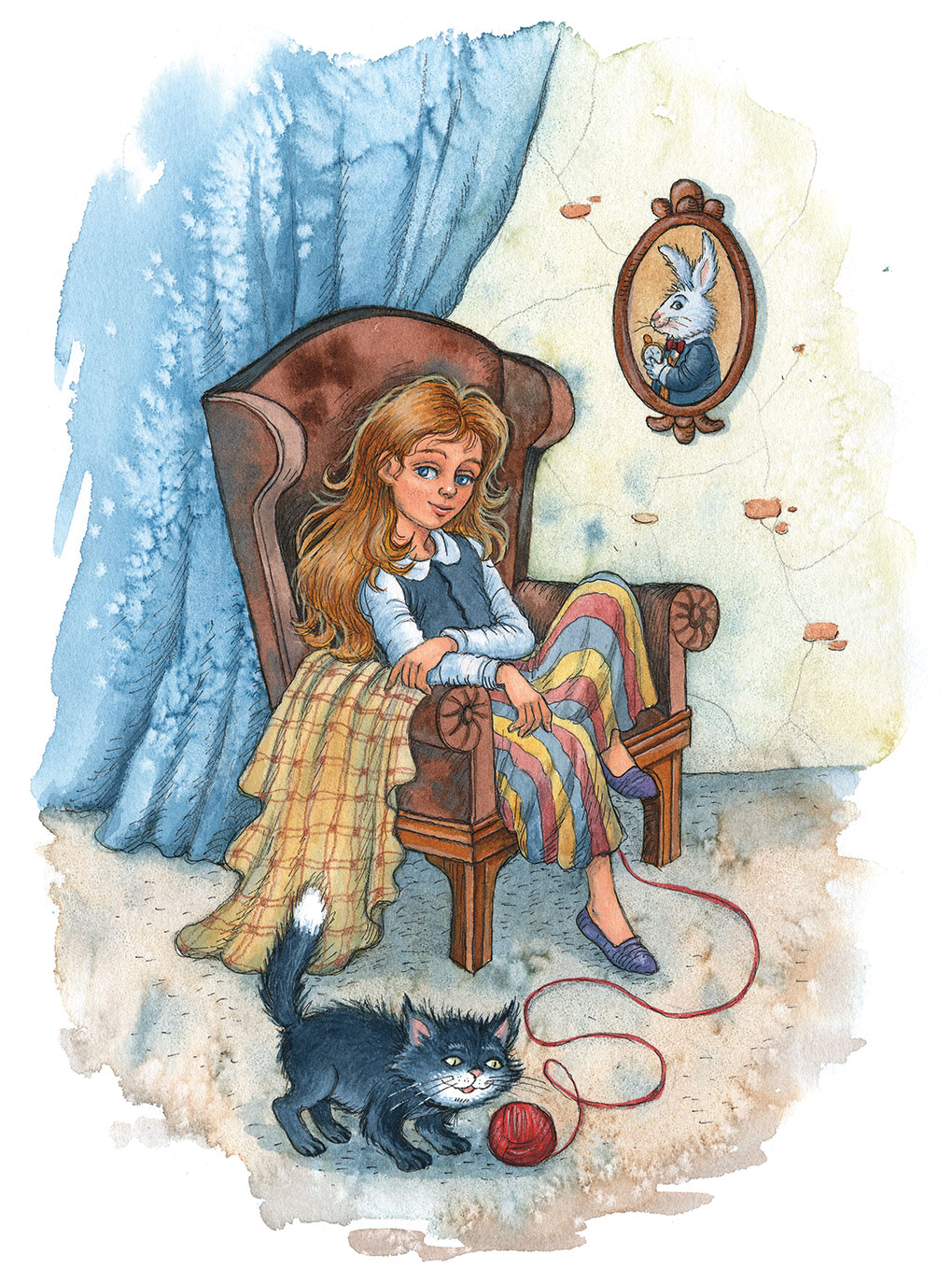 Потом она опять взобралась в кресло, взяв с собой котёнка и моток, и начала наматывать шерсть на бумажку, но дело шло медленно, потому что она всё время разговаривала то с котёнком, то сама с собой. Китти же солидно сидела у неё на коленях и усиленно притворялась, будто ей страшно интересно наблюдать, как наматывается нить. Иногда она даже протягивала лапку и дотрагивалась до клубка, словно хотела показать, что с удовольствием помогала бы Алисе, но не знает как.