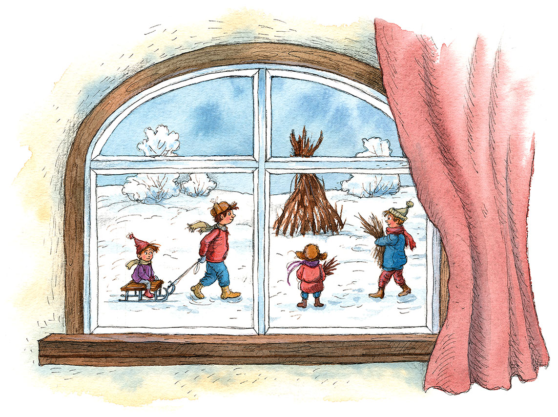– Слышишь, как снег стучит по стеклу? И так тихо. Всё вокруг будто спит: и деревья и поля, – плотно укутанное белым покрывалом. И так до весны. Как только снег растает, побегут ручейки, они оденутся во всё зелёное, будто кружевное, и будут танцевать, когда подует ветер. Ах, как это красиво!