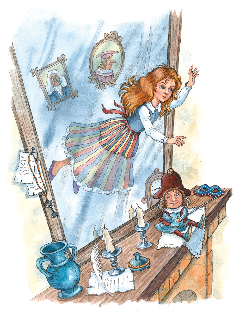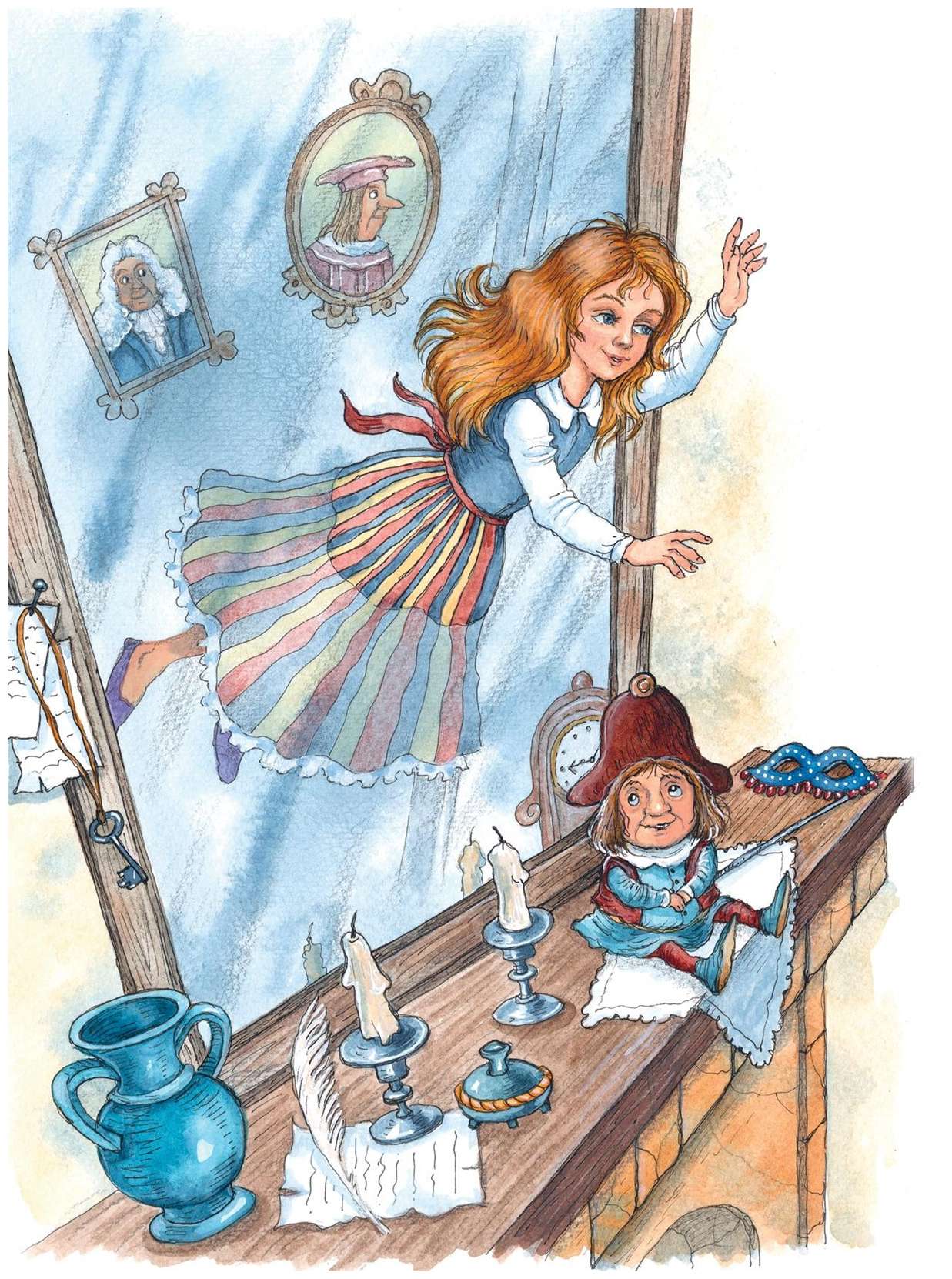 Получше разглядев комнату, девочка убедилась, что та её часть, которая была хорошо видна из гостиной, совершенно обыкновенная, зато другая совсем иная. Так, например, картины на стене, у камина, казалось, ожили, а часы на каминной полке (вы ведь знаете, в зеркало видна только их задняя сторона) стали вдруг похожими на ухмыляющуюся физиономию добродушного карлика.