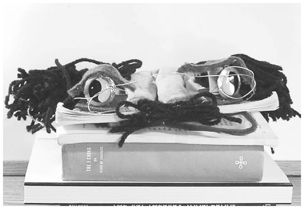 Да, я, конечно, ворчун.А кто бы не был таков,Если бы простоял на полкеПару или тройку годков?Ворчун ГручоПроснувшись после короткого сна, я решила снять эту несдержанную книгу с полки и облегчить ее участь. Почему бы не создать некое пространство, где она могла бы постепенно выпрямиться и прийти в себя? У меня было немного времени, так что я пошла в подвал, где я храню все свои материалы и художественные принадлежности, и позволила Этому проявляться дальше. (Конечно, я помогала с помощью небольшого количества клея и пряжи.) Книга преобразилась в куклу, которая напоминала Гручо Маркса в очень плохом настроении. Я назвала ее Ворчуном Гручо. Рот Гручо можно открывать и закрывать, засовывая руку в перчатку, прикрепленную к его переплету. Когда его рот открывается и закрывается, он издает очень неприятный, хлопающий звук.