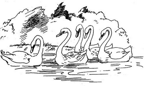 Suddenly a soft blue light lit up everything in this pitch darkness. Gargulio saw how five beautiful swans, as white as the fresh snow at New Year, glided along the water directly to him. The swans stopped in their tracks several steps from the man and their leader glanced sternly, solemnly, and a little sadly at Gargulio.