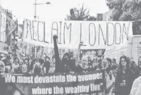 Рисунок 2. Классовая борьба в Камден Лок. Надписи на плакатах: «Исправьте Лондон», «Мы должны опустошить улицы, где живут богачи»