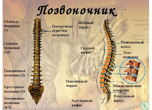 – Состоит из 33—34 позвонков, разделенных на шейный, грудной, поясничный, крестцовый и копчиковый отделы.