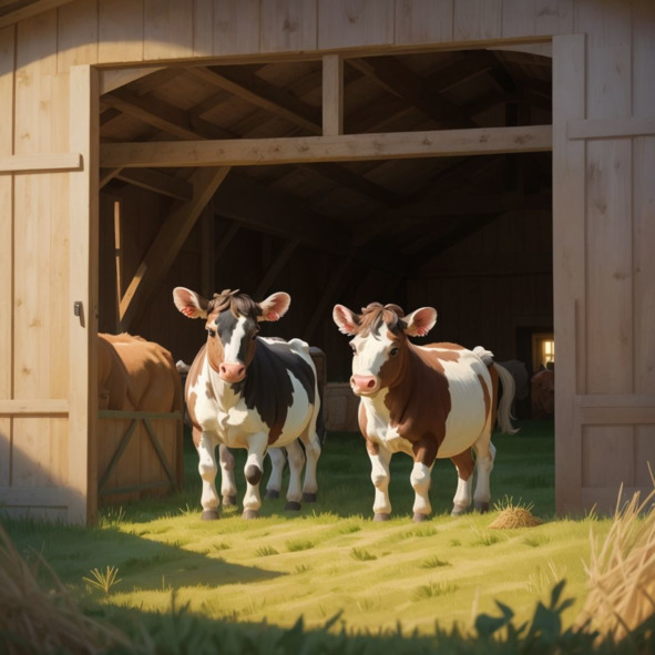 When they arrived at the farm, they were greeted by Farmer Joe. He was very friendly and had a big smile. «Welcome to my farm!» he said. «Are you ready for some fun?» Luke and Leila nodded eagerly. Farmer Joe took them to the barn first. The barn was filled with hay and smelled like fresh grass. They could hear the sounds of animals inside.