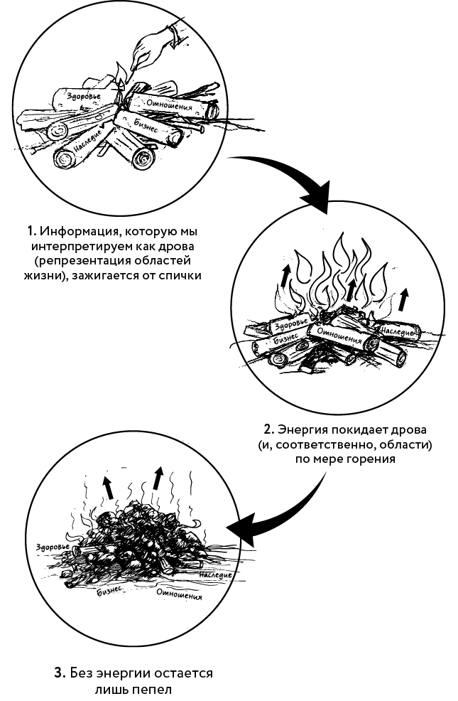Когда рядом с этими дровами была зажжена спичка и их коснулась небольшая искра энергии, дрова не могли больше саморегулироваться и поддерживать свою форму. Энергия ВЫШЛА из дров в виде огня. Энергетика системы перевела скрытую, или потенциальную, энергию дров в тепловую и световую. Информация, которую мы интерпретировали как дрова, перестала существовать. Вместо этого перед нами теперь пепел. Энтропия – как в науке называется распад в ничто – взяла свое.