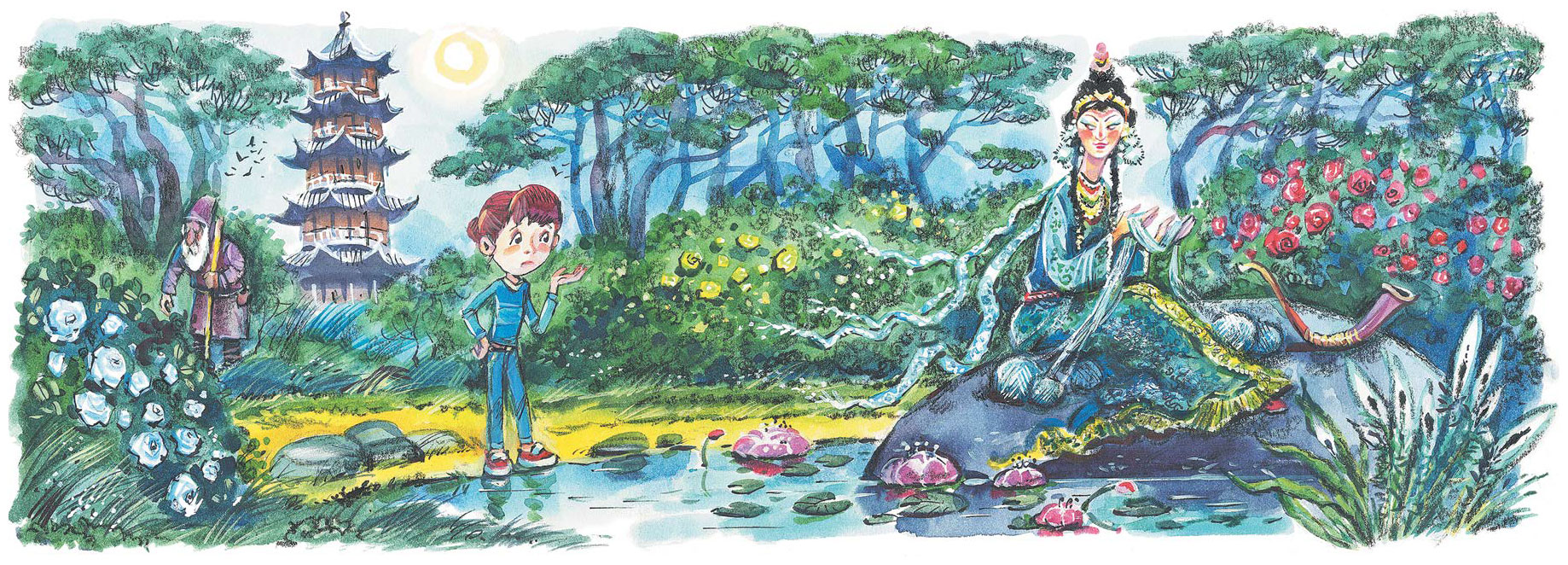 Вскоре она выбралась к маленькому пруду возле той самой колдовской пагоды, что превращалась то в пирамиду, то в скалу, то в замок. На камне сидела девушка восточной внешности и трубила в рог. Так вот откуда звук! Даша протиснулась сквозь колючие розовые кусты ближе, а девушка заметила её и опустила инструмент.